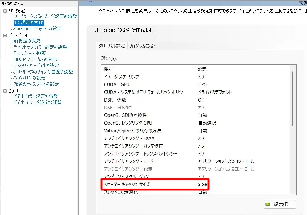 再び上記の設定を開いて、シェーダーキャッシュサイズの項目を「デフォルト」など、自分のPCにあった設定にする。ちなみに「デフォルト」は4GBらしい? あるいはPC環境による?