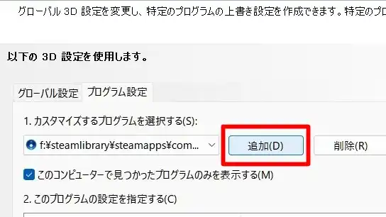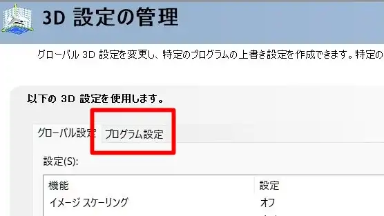 「3D設定の管理」から「プログラム設定」をクリック、