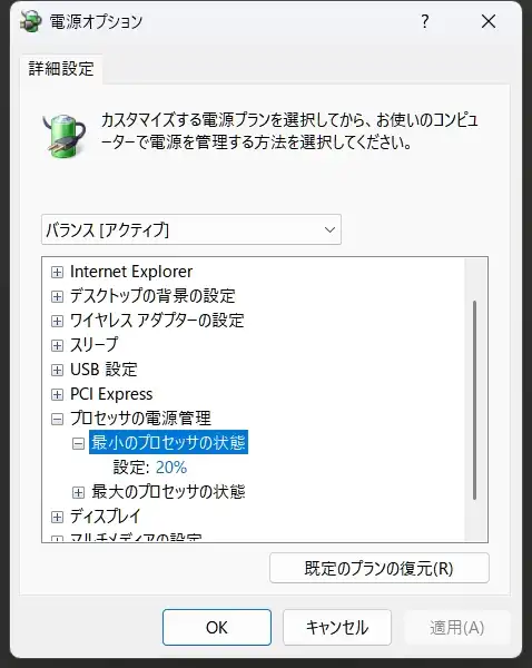 「電源プランの編集」から「詳細な電源設定の変更」、そこから「プロセッサの電源管理」内にある「最小」が0になっているかチェック。